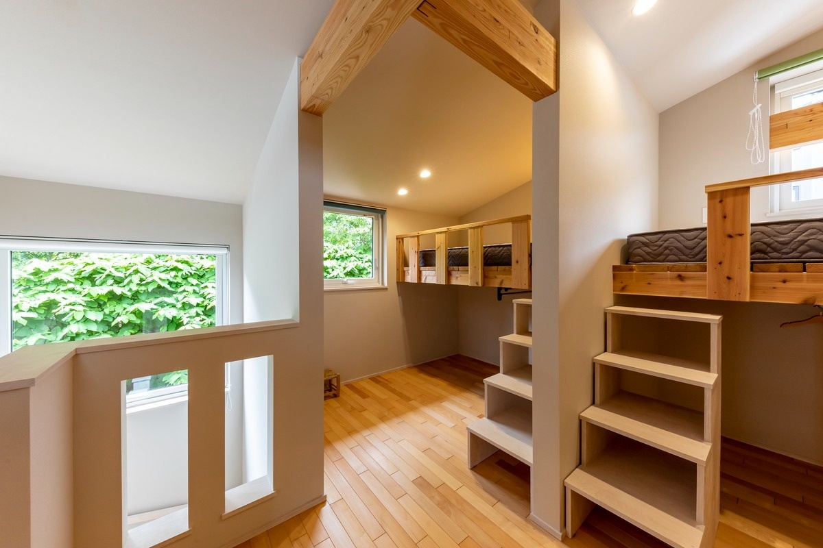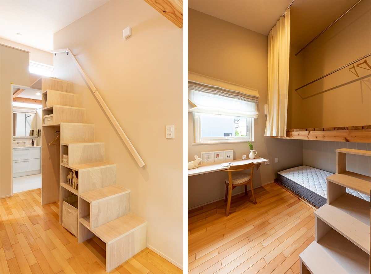 勾配天井を生かしたロフトタイプの空中クローゼットや、ロフトにつながる収納を兼ねた空窓階段など、ユニークな空間活用法も同社が得意とするところです。