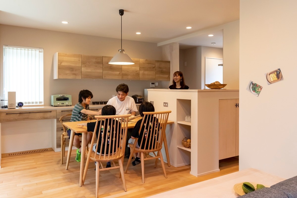 マイホームのプランニングでは、帰宅した子どもたちがリビングを通って2階に行けるように、LDKの中心に階段を移動するなど、Hさん夫婦の希望を盛り込みながらプランをカスタマイズしています。