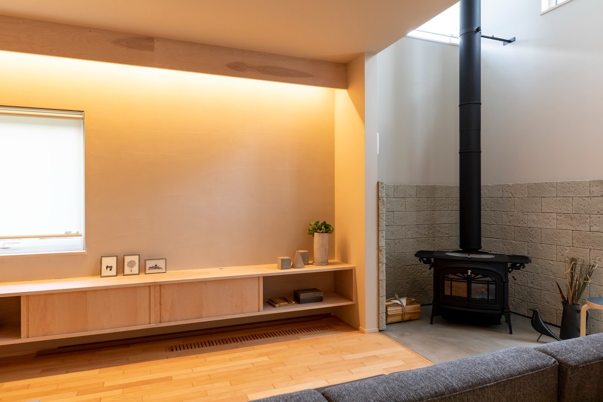 室内は床にブナ材を用い、造作棚などに用いた道産シラカバ材の質感が洗練された空間を演出しています。また、キッチン収納の天板やエンドパネルを見ると、室内のトーンをまとめるためにシラカバ材で覆うひと手間が加えられていました。