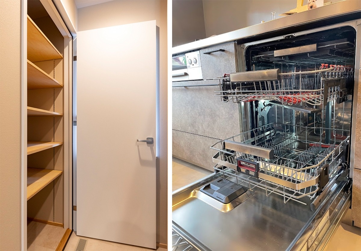 保冷機能の付いた食品庫も完備しています。中でもこだわったのは、フロントパネルが美しいAEG(ドイツ製)のビルトイン食洗機。大容量で、扉が前面に開閉するため、使いやすそうです。