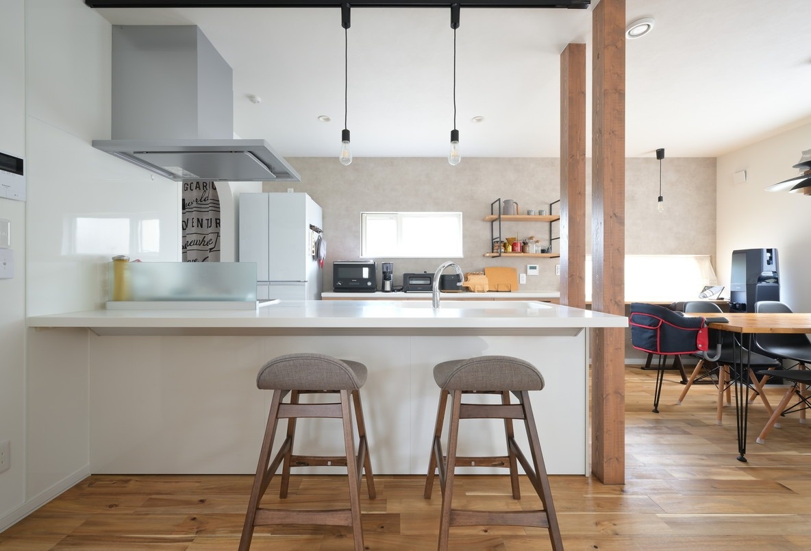 キッチンはリビングと階段に向かって配置されています。左手にはダイニングがあり、キッチンからはLDK全体が見渡せる造りです。階段を行き来する家族の様子も見守ることができます。