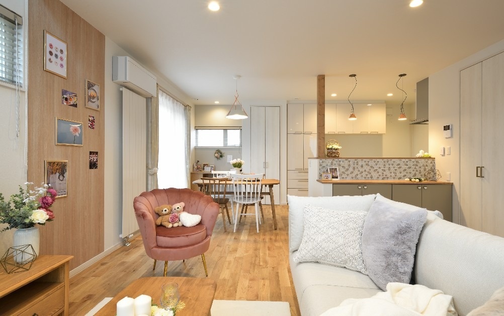 その後、モデルハウスを見る機会があり、「ここに住みたい!」と思うような居心地の良さを実感し、施工の依頼を決めました。ホワイトを基調に、ブラウンやピンクのファブリックをポイントにした、「大人かわいい」という表現がぴったりの、おしゃれな家でした。