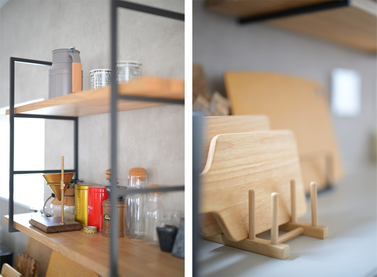 アイアンのオープンラックには、奥さまが大好きなコーヒーのアイテムが並んでいます。