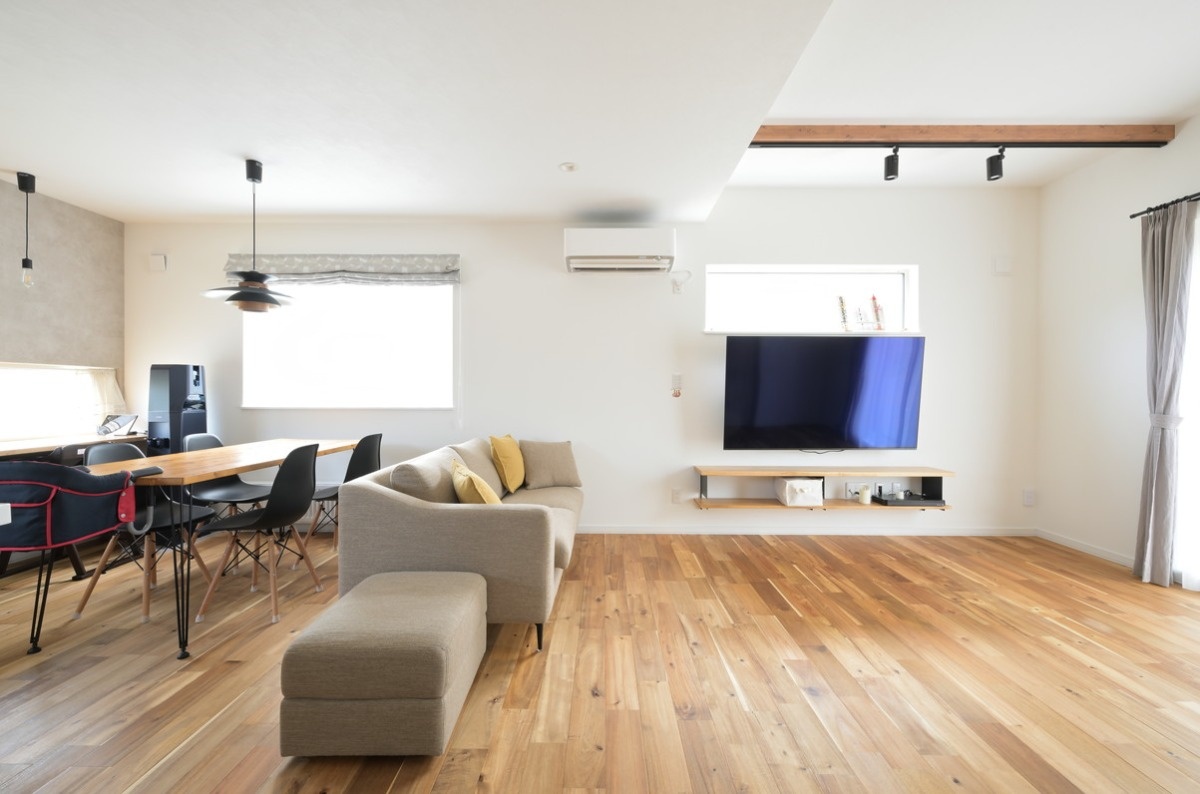 1階には21.5畳のオープンなLDKが広がっています。リビングは吹上天井になっていて、より開放感を演出しています。