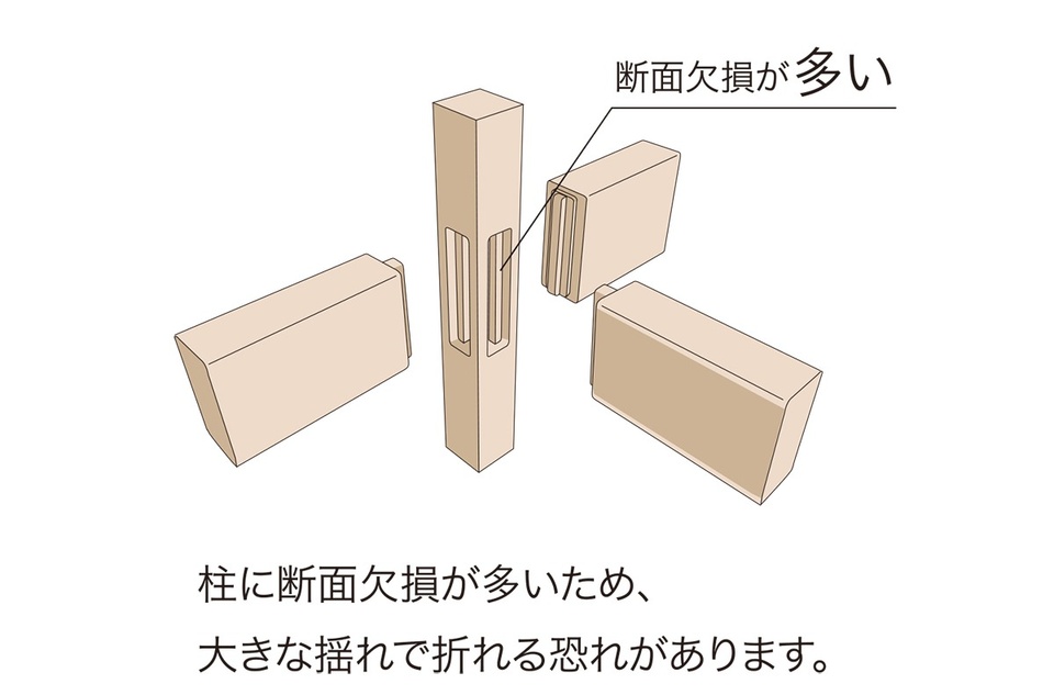 一般の木造在来工法では、柱と梁をつなげる部分に「ほぞ」と呼ばれる穴加工をしますが、その穴が強度不足につながるという指摘もあります。