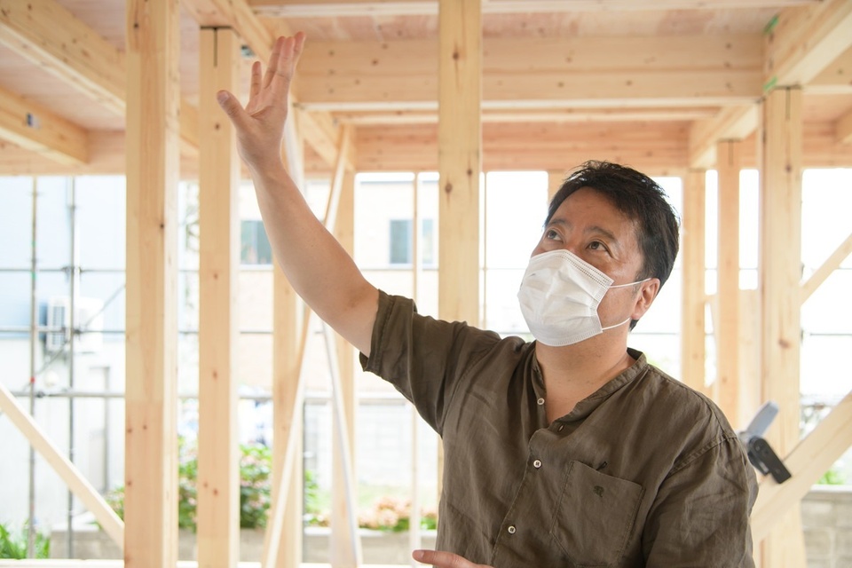 8月下旬、今度は高耐震を叶える「SE構法」を採用した工事が進行中と聞き、早速現場を訪れました。現場を見学しながら、篠崎社長にお話をうかがいます。