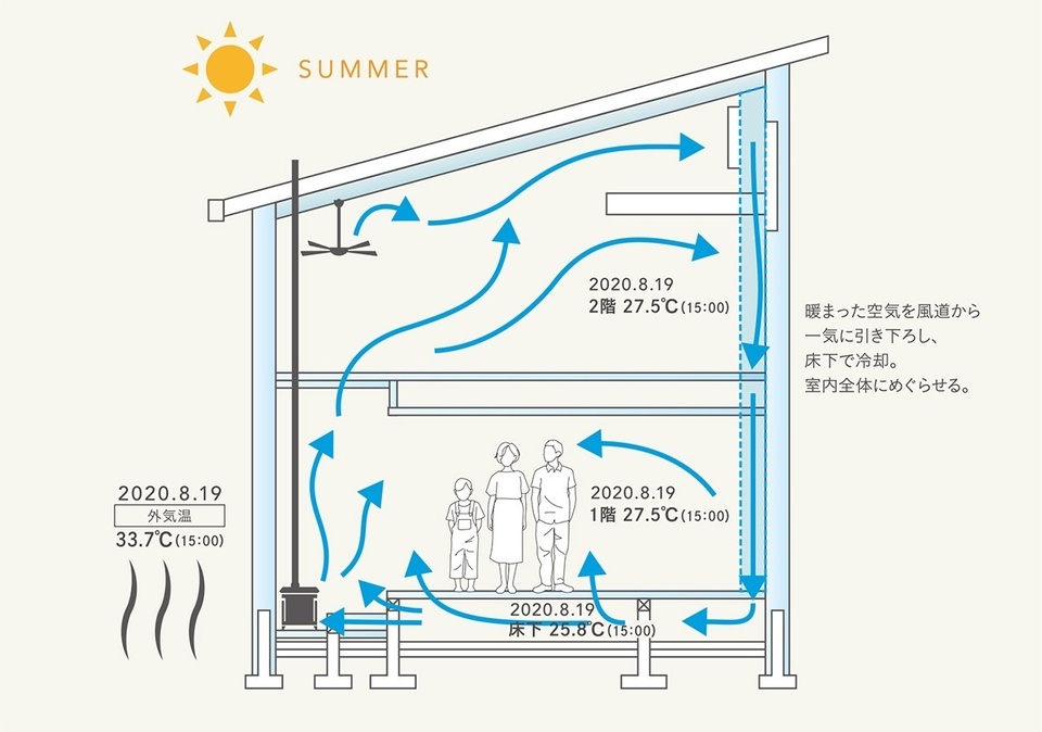 2020 年からは、小屋裏に設置したDCモーターのわずかな電力を使って、熱や冷気を家中に循環させるラディアント・サーキュレーション・システム(特許申請中)を開発し、標準化しました。