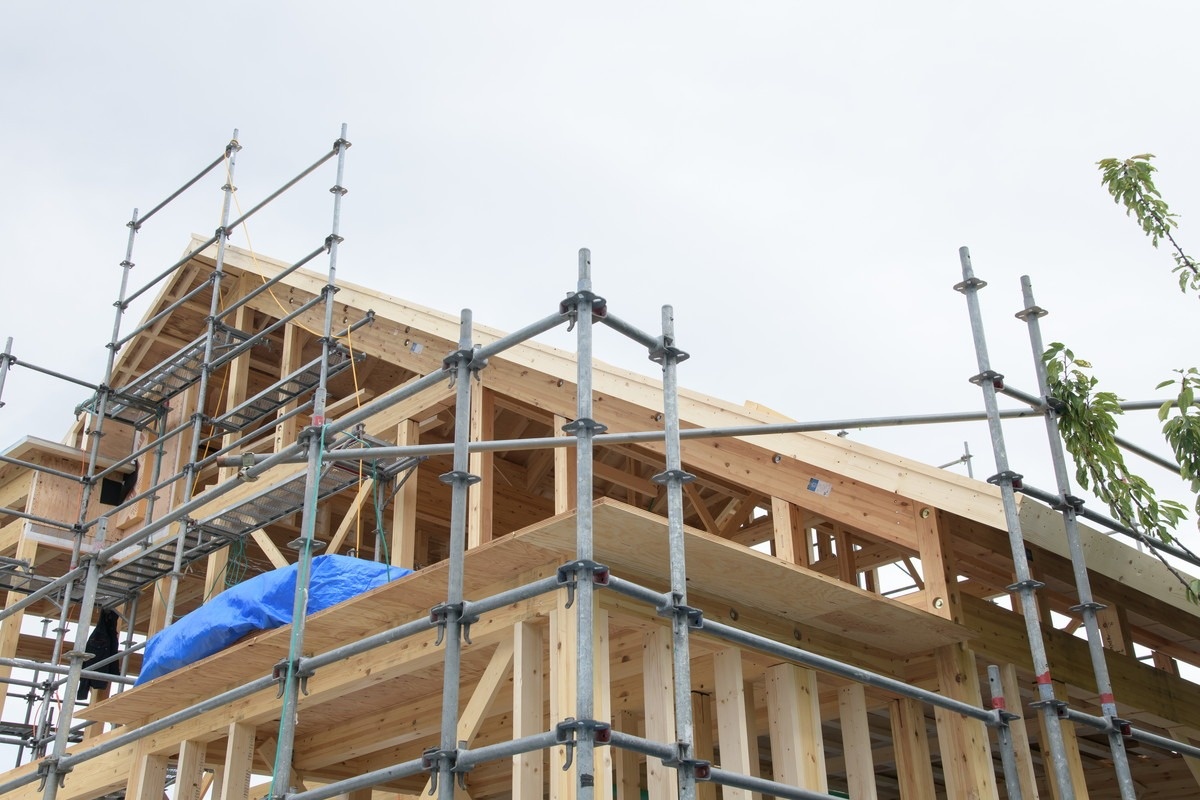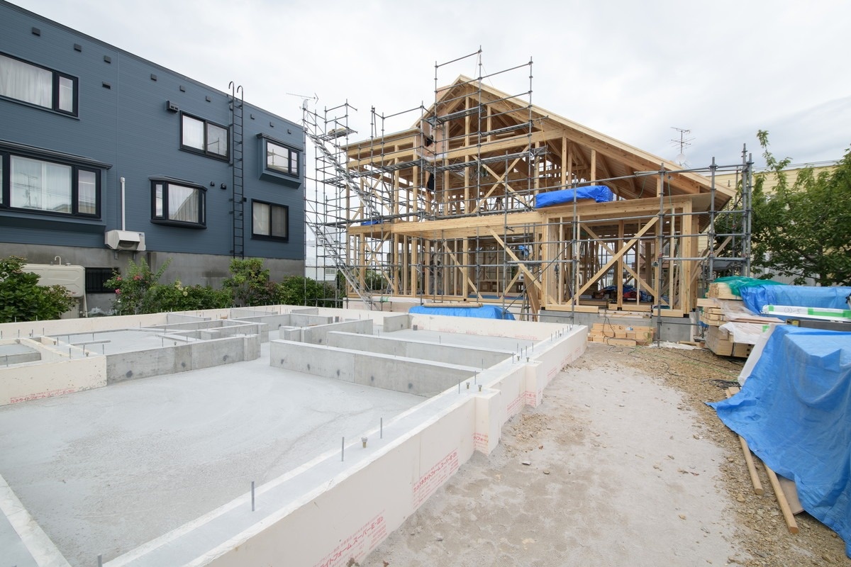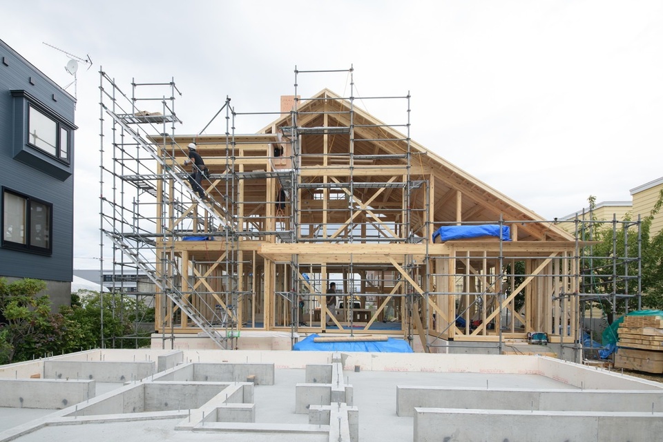 取材当時は奥の親世帯の棟上げが終わり、子世帯の基礎工事が進行中で、親世帯の屋根下地の合板や間柱を組む段階に入っていました。