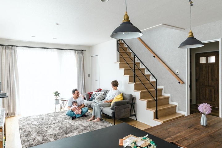 水まわりやキッチンの工夫によって、基本のプランよりも面積を広げたリビングは、ご家族3人、時には友人を交えて楽しむ憩いの場に。「広くしてもらったんですが、さらに圧迫感を減らしたくて、リビングと階段を隔てる壁をなくしてもらいました」。