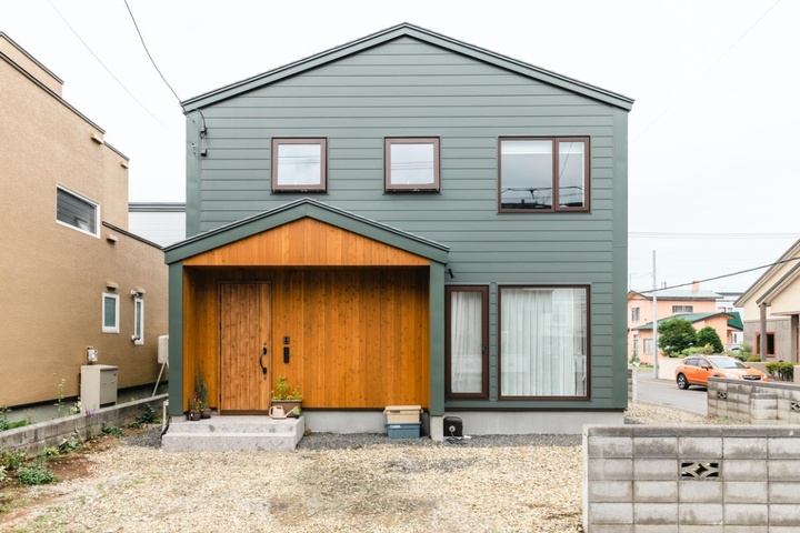 「LIVPLUS DO」は、同社の住宅商品の中で唯一、三角屋根を採用しています。「嫁さんも自分も、この外観を気に入ったんですよね。住宅展示場やモデルハウスを見て回った際も、三角屋根の家はあまり見かけなかったので、珍しくていいなと思ったのが第一印象です」。全面を覆うガルバリウム鋼板も、珍しい色ということでモスグリーンをセレクト。玄関まわりの道南杉板張りとの相性も抜群です。