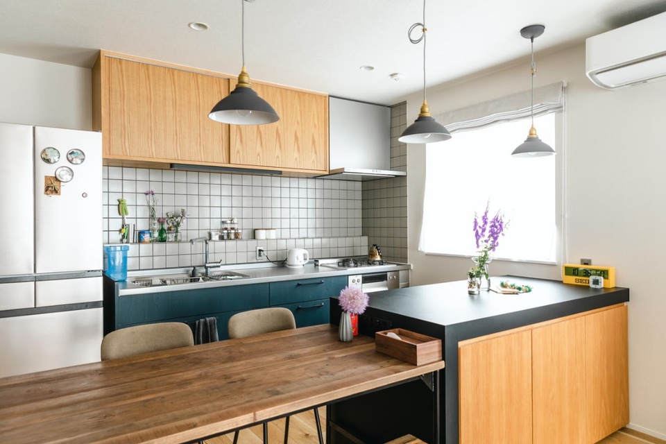 ネイビーにグレーのタイルを組み合わせたキッチンは奥さまによるコーディネートで、全体的にナチュラルな雰囲気でまとめた空間のよいアクセントになっています。