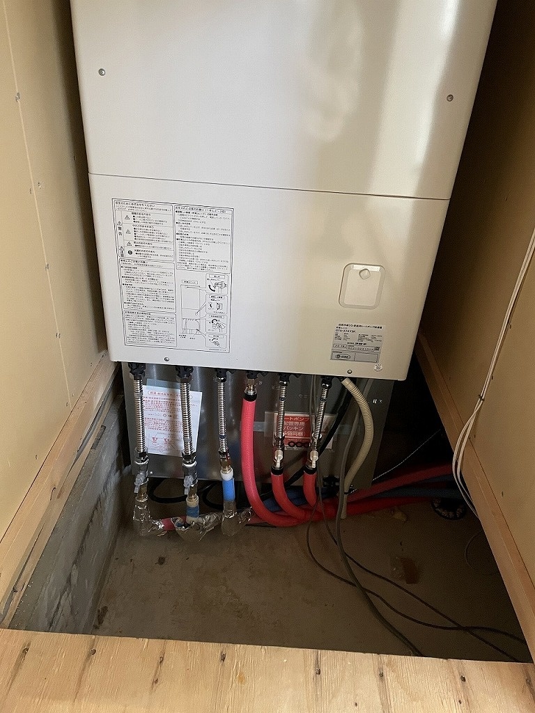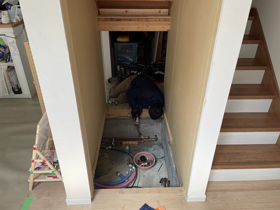 その階段下から既存のボイラーを運び出したあとの作業がこちら。新ボイラーのために配管などを整えます。