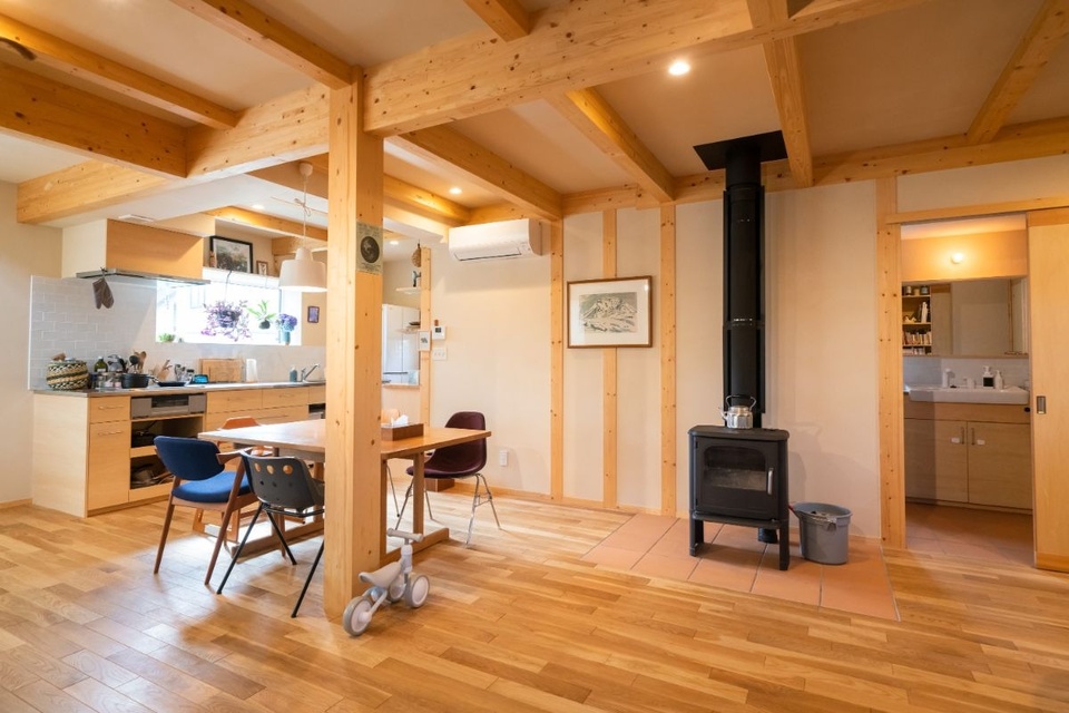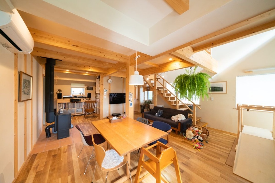 この家は、外壁が高性能グラスウール16㎏210mm+105mm=315mm、UA値=0.24の超高断熱仕様になっています。夏は朝の涼しい風を取り込めば長時間涼しく、冬は朝、薪ストーブを焚けば夜まで室内の温度差が少なくずっと快適に過ごせます。