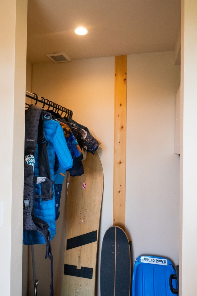 アウトドア好きのご夫婦は、子どもは自然の中で遊ばせ、早いうちから薪や火の扱いもさせてみたいと考えています。玄関奥の物置スペースも、アウトドアグッズで占められていました。
