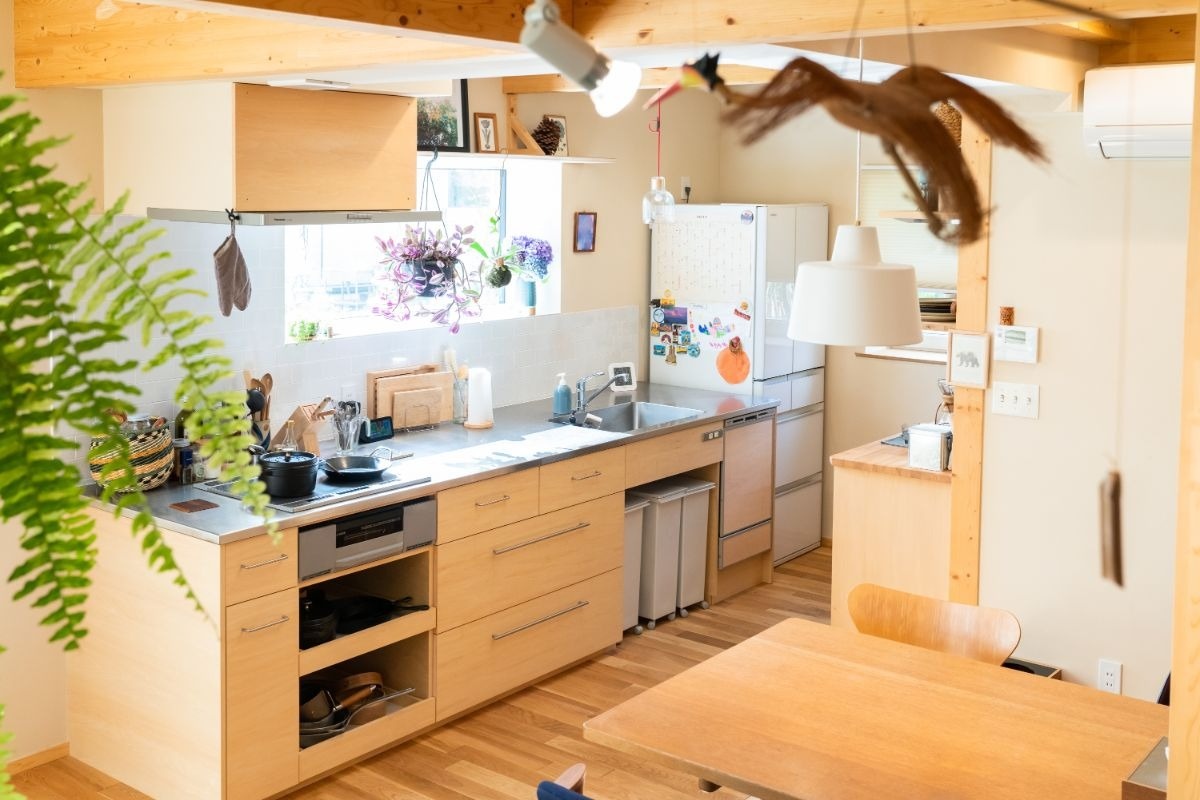 リビングダイニングの奥にあるキッチンは壁付けです。「先輩の家のキッチンも壁付けで、広くて空間効率がよいと藤井さんもすすめてくれました」とご主人。