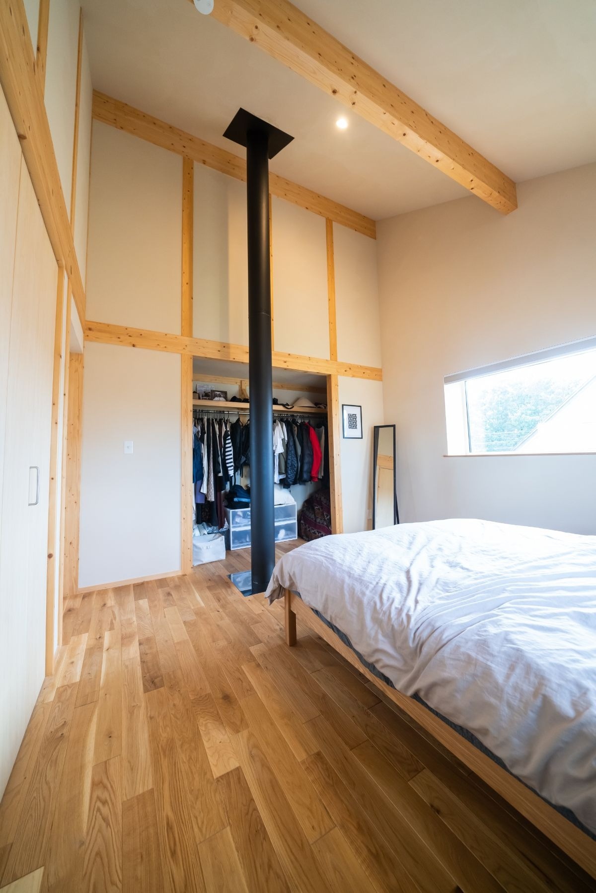 薪ストーブの煙突は2階の寝室を通って屋根に抜けています。