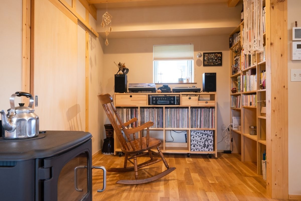 LDKからやや奥まった一角にはオーディオスペースを作りました。ロッキングチェアに揺られ、冬は薪ストーブに薪をくべながら好きな音楽が楽しめる、ご主人お気に入りの場所です。
