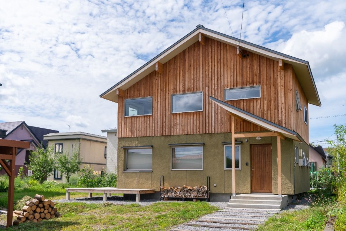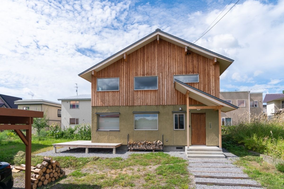 2階がカラマツの板張り、1階はモルタル壁。ウッドデッキがあったり薪置き場もあり、ナチュラルでやさしい外観です。