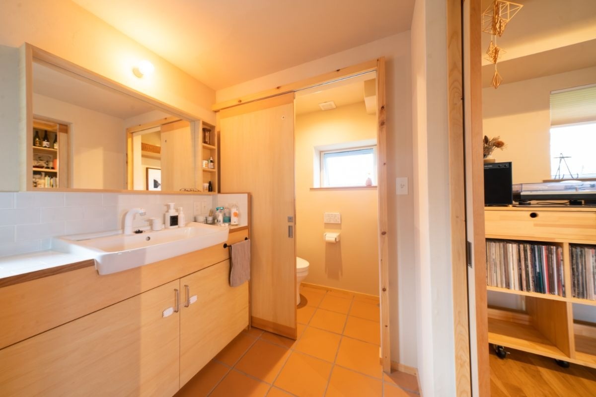トイレとユーティリティは1カ所にまとめました。洗面収納もオーダーによるもの。床材はテラコッタタイルにしたので掃除しやすく衛生的です。