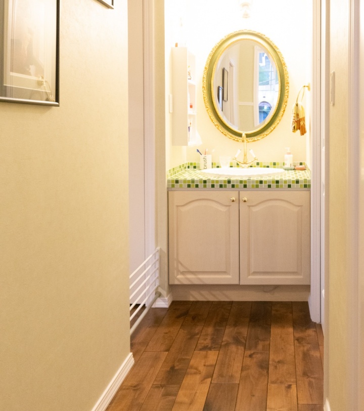 奥さま 洗面台はオーダーで作って頂きました。お客様も利用されるので脱衣所に入らずに手を洗えるように独立型にしてもらいました。
