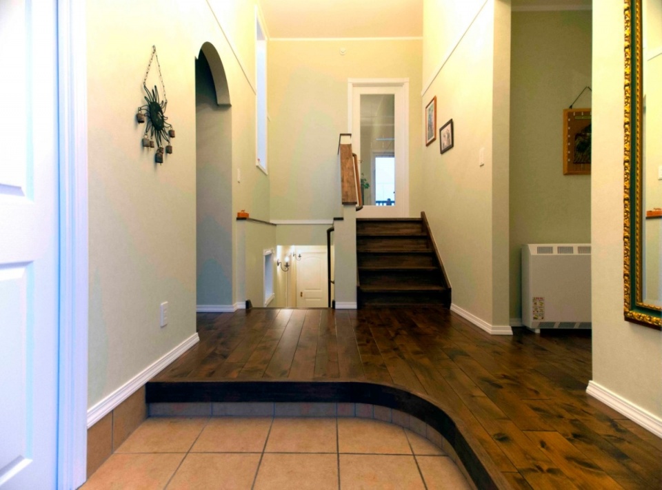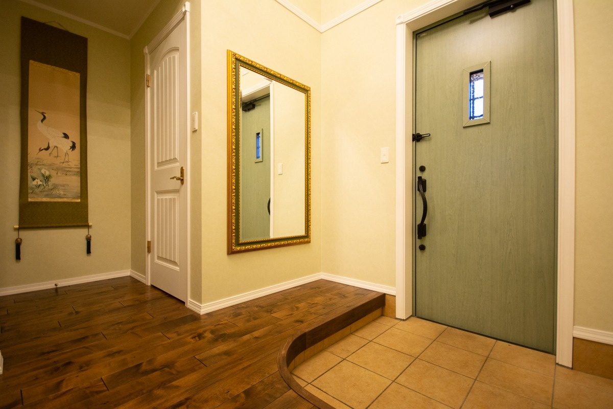 玄関ドアやクロスは淡いグリーン系、木製床や玄関床タイルは茶系でコーディネートされています。洋風インテリアに大きな額縁付きの鏡や掛け軸などが調和し落ち着いた雰囲気を醸し出しています。