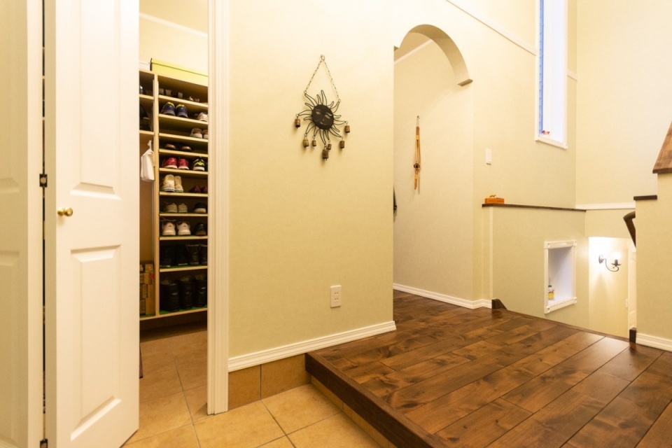玄関まわりに生活用品を置かず、すっきり見せるため、左のドアの向こうにウォークインのシューズクロゼットがありました。