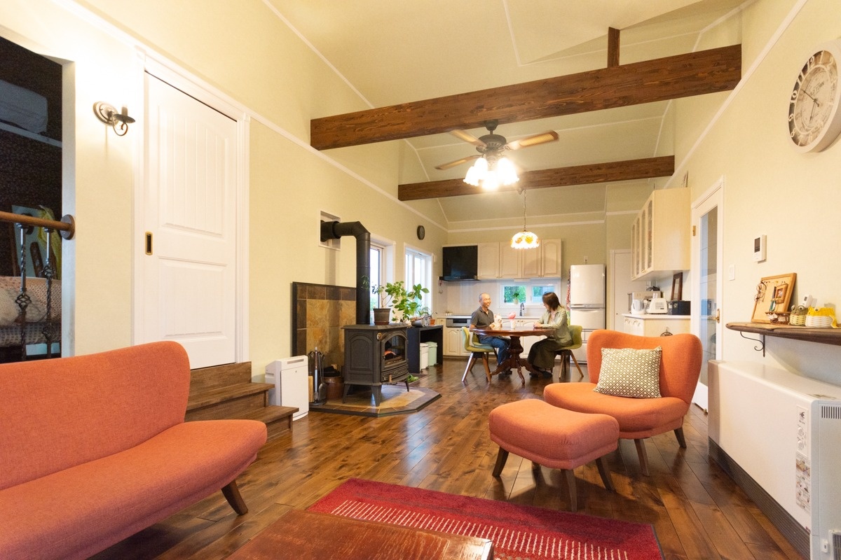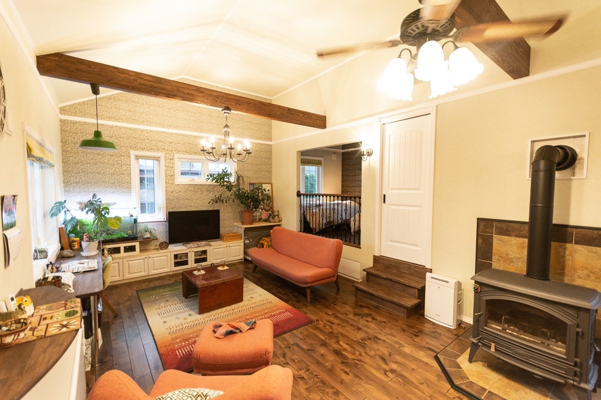 リビングに入ると正面に薪ストーブがあります。冬になると炎のゆらめきを眺めながら暖まると気持ちも癒やされるそうです。