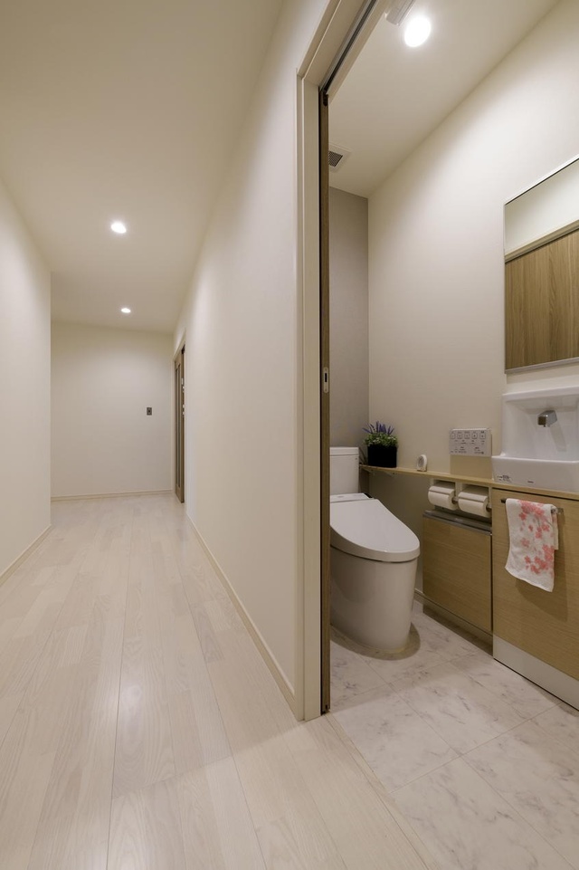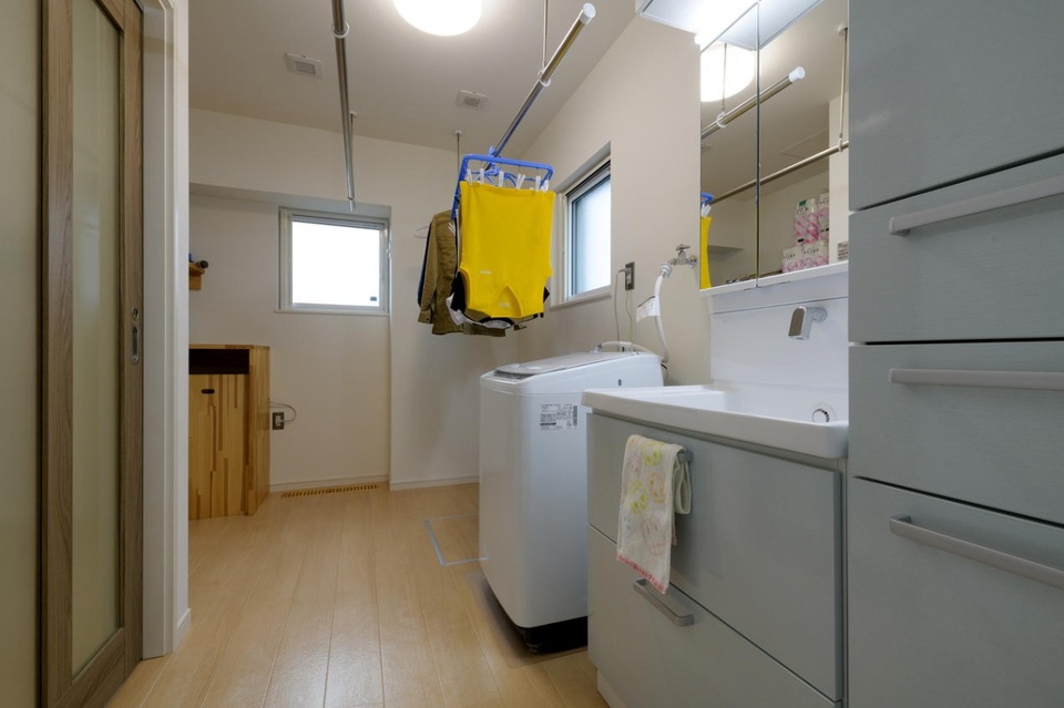 玄関を入ってすぐにトイレがあり、その奥に浴室、脱衣洗面室兼ランドリースペースが備えられています。