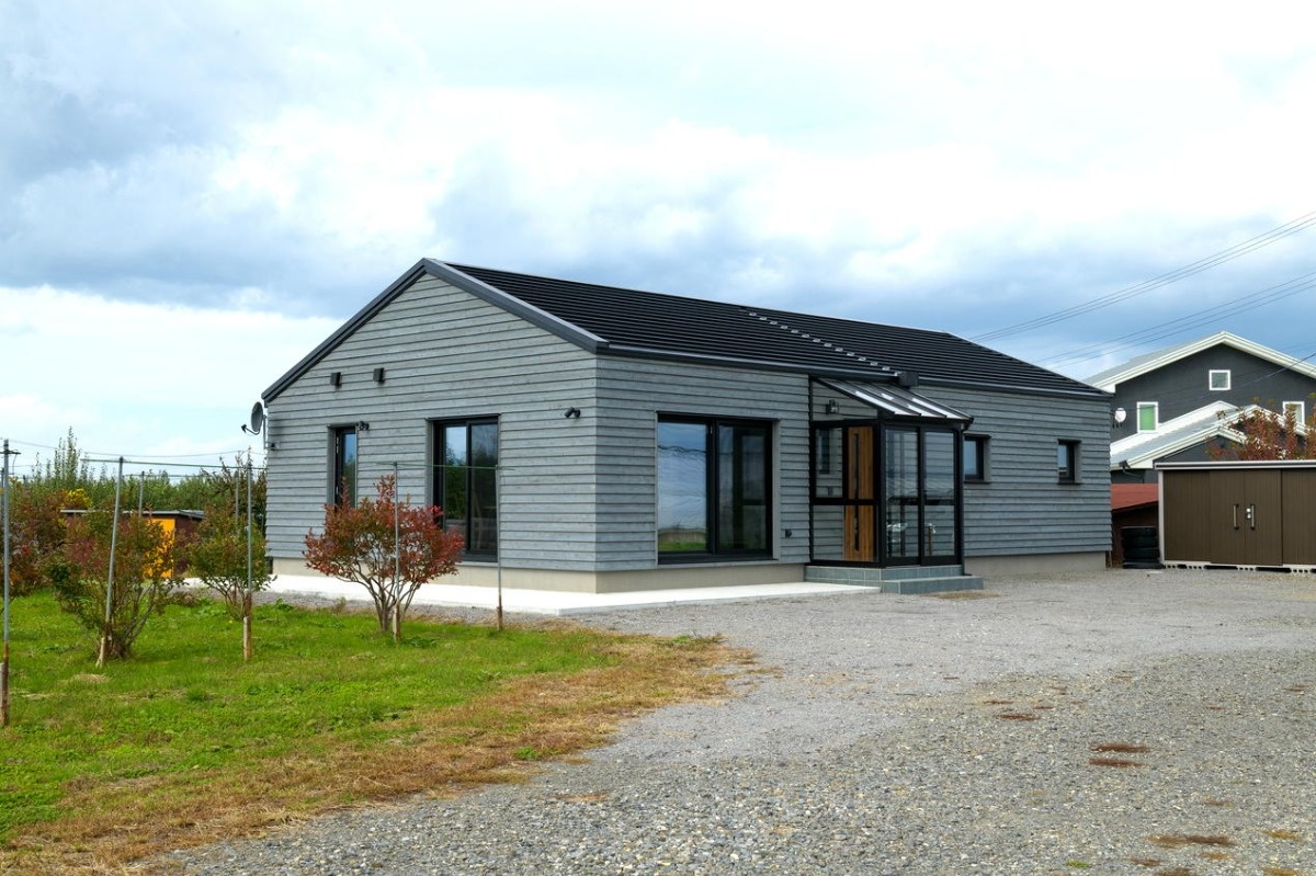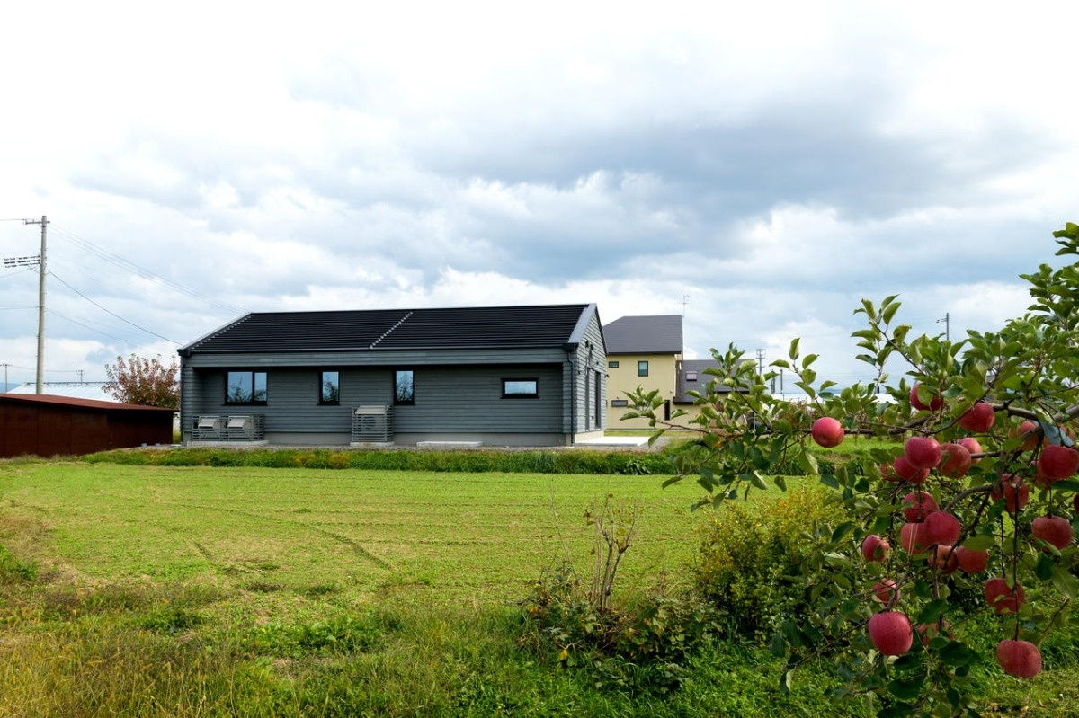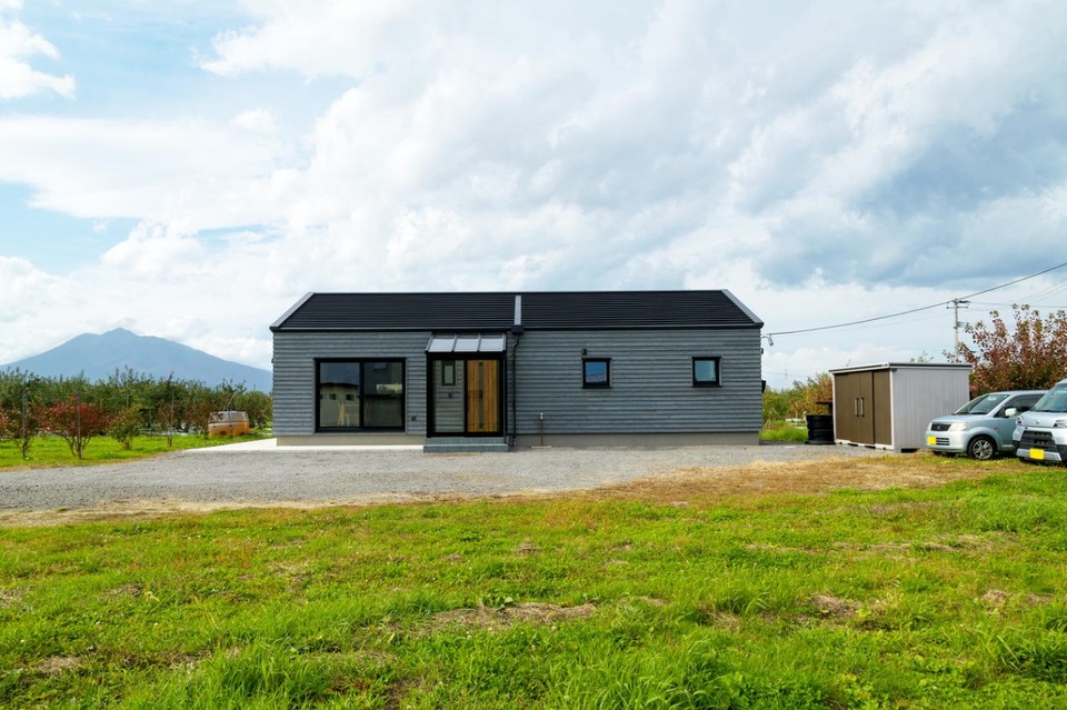青森県南津軽郡田舎館村。岩木山とりんご畑を背景に、切妻屋根がシンプルな平屋の家が建っています。こちらはSさんの住まいで2020年11月に完成しました。