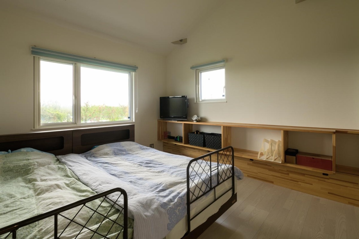 居室スペースは横並びで3つ設けていて、どの部屋からも岩木山が眺められます。息子さんの部屋は学習机のすぐそばに窓が。