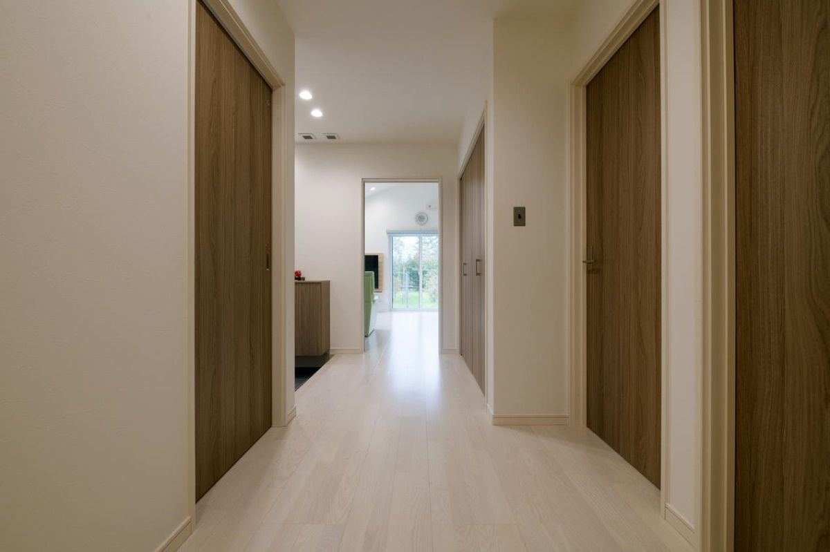 トイレや洗面室などの水回りの生活音が寝室や子供部屋に届かないようにしたいと、水回りと居室3部屋を広い廊下で分けました。廊下は無駄な空間ともとらえられがちですが、広く設計することでプライバシーの確保がしやすくなります。