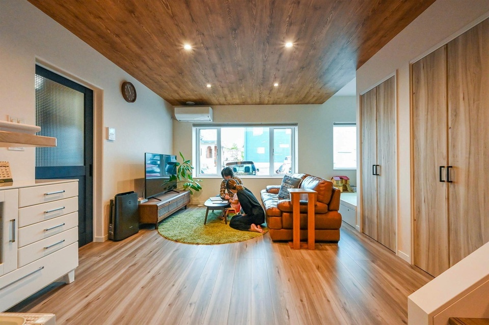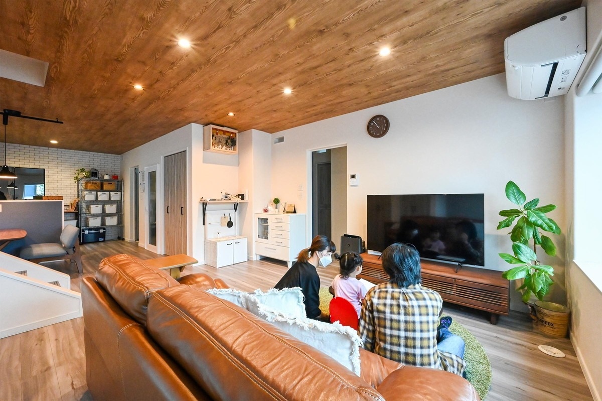 床や壁、天井などは色でメリハリをつけたかったというSさん。1階のLDKの床と天井には木目調のフローリングとクロスを採用しました。