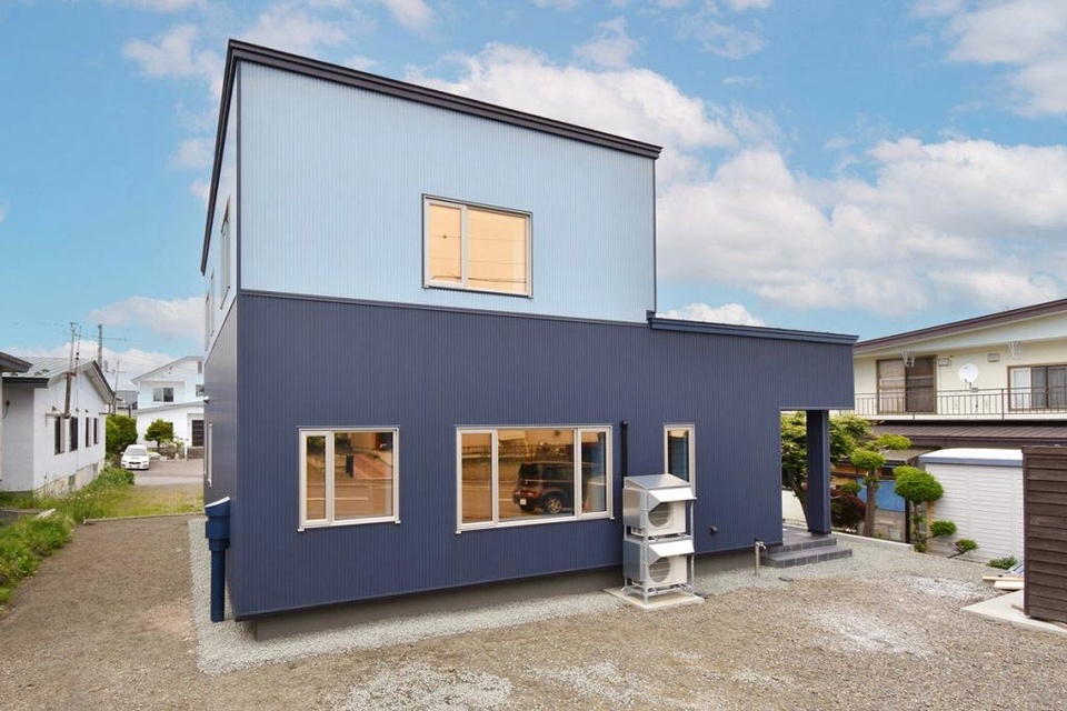 外観は1階を濃いブルー、2階を薄いブルーとコントラストを付けた2色使いの金属サイディング張りで、遠くからでも目を引きます。
