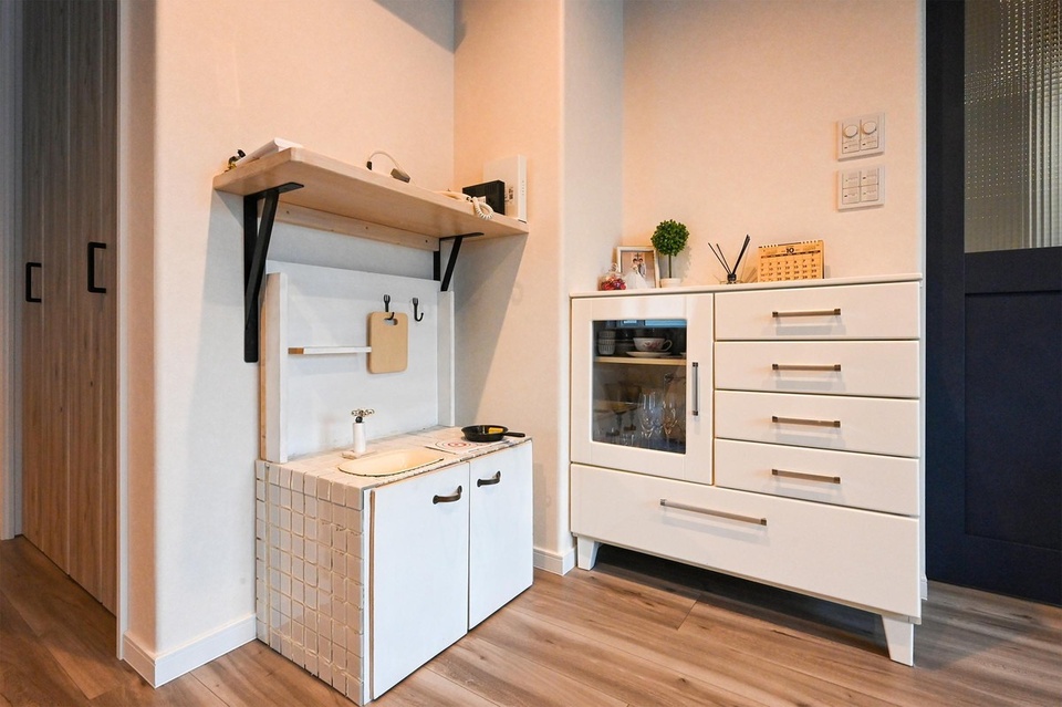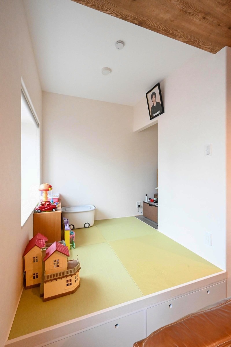 リビングの一角には小上がりの和室も。「母の仏壇を置く仏間がほしい」というSさんの希望を叶えた和室です。仏壇は奥まった場所にしつらえ、普段はお子さんの遊び場として活用しています。小上がりにしたことで床下収納も生まれ、おもちゃなどをしまっています。