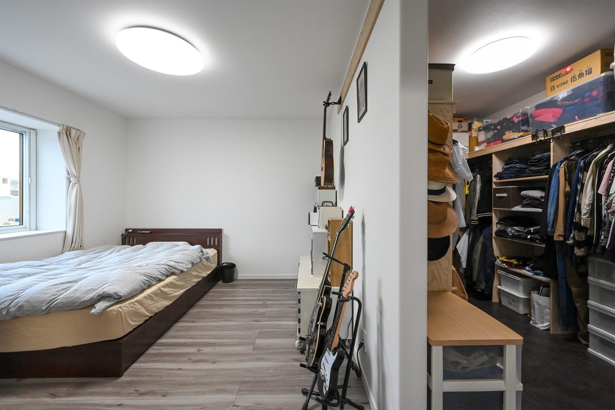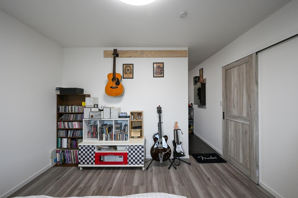 2階のご夫婦の寝室には、バンドでギターを弾くSさんのこだわりから、壁に下地板を施工してギターを飾れるように。