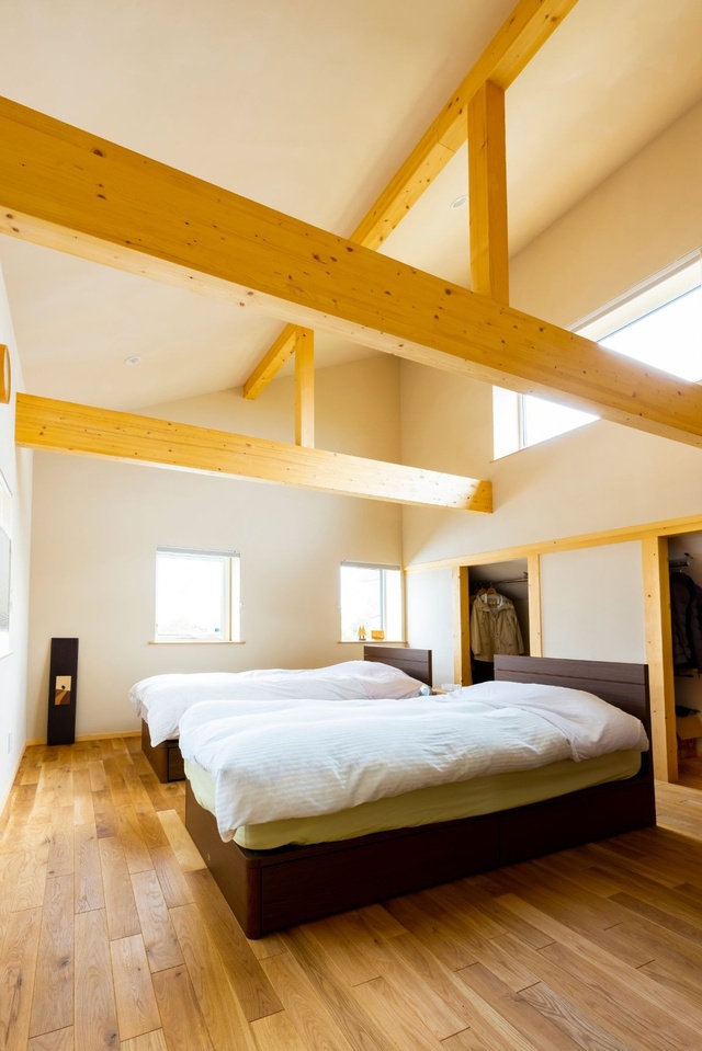 2階には、ロフトスペース以外に寝室も設けました。天井が最も高いところで4m以上と、こちらは開放感抜群です。「天井が高くて朝陽も入ってくるので寝起きが気分爽快です」とご主人。