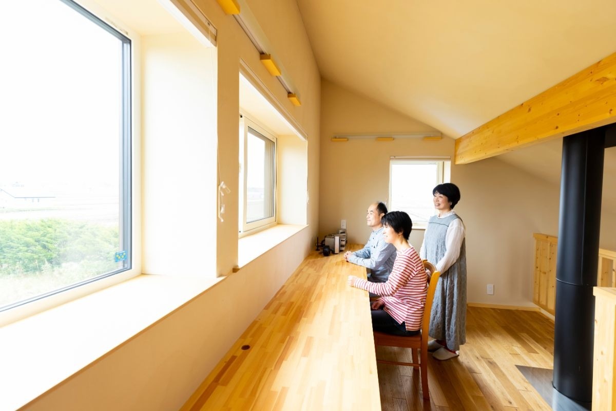 Tさん「2.5階の窓からは夏には町の花火も楽しめます。高いところから山が見たいとわがままを言いましたが、眺望は最高です。ウッドデッキの向きや2.5階の斬新な提案など藤井さんのプランは自分たちでは考えもつかなかった構造で、希望以上のものでした。室内の扉や無垢の床材、現しの天井など、職人さんたちの仕事、手間がふんだんに盛り込まれた満足感の高い住まいです。東川の美味しい水、お米をはじめとする地元の食材、買い物など日常生活も東川内でほとんど完結しますし、買い物は旭川でもインターネットでも手に入るので不自由なく暮らせます。東川町に移住し、思い通りの家が建てられて本当によかったと思います」