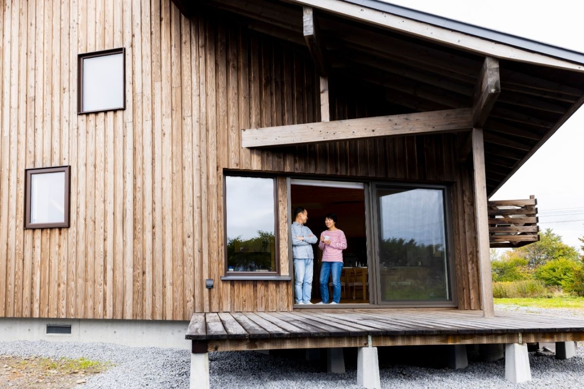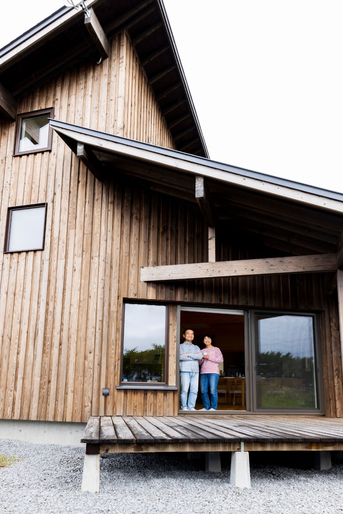 ウッドデッキを前に語らうのはTさん夫婦。東川町に2022年3月、念願だった終の棲家を建てました。ウッドデッキからはまっすぐに十勝岳が望めます。設計・施工をしたのは藤井光雄工務店です。