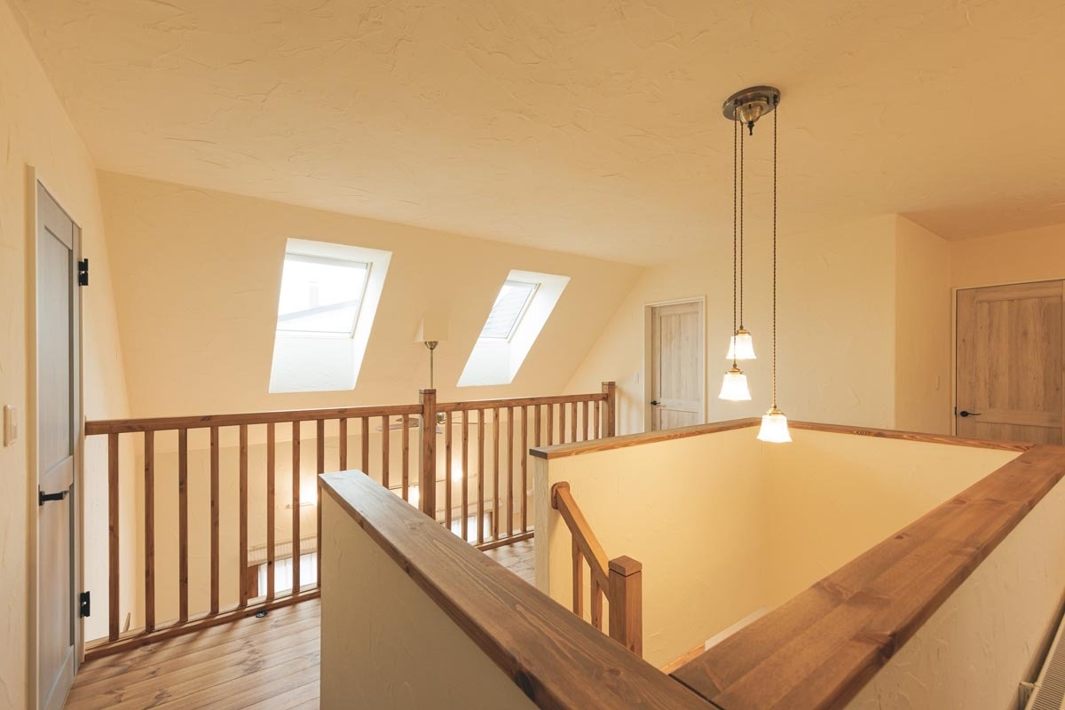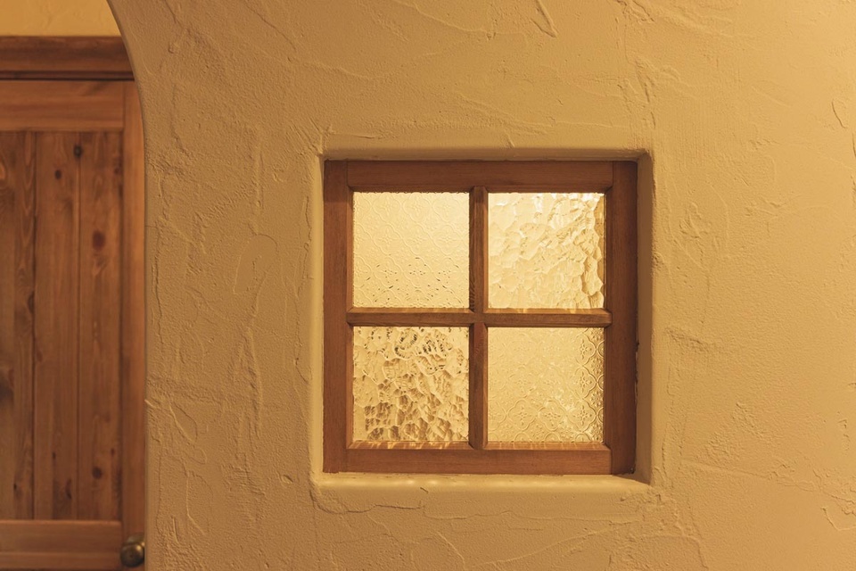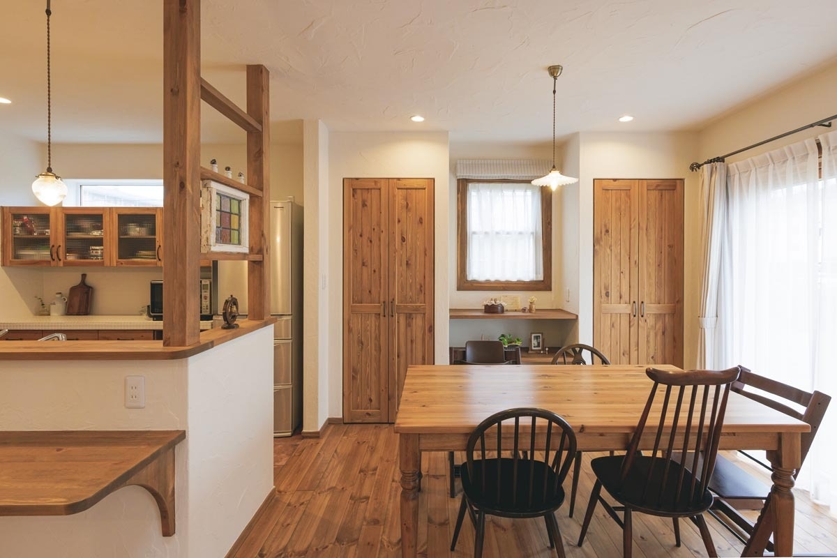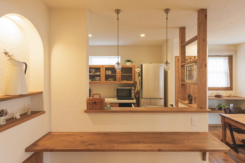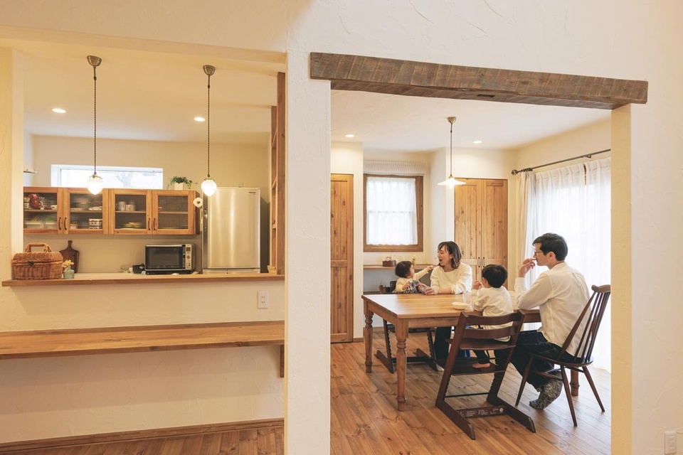 手仕事のぬくもりを感じさせる漆喰の壁に、やわらかな明かりの灯るダイニング。「ここから眺める景色が好きなんです」と教えてくれたのは、ふたりのお子さんとこの家に暮らすOさん夫妻です。