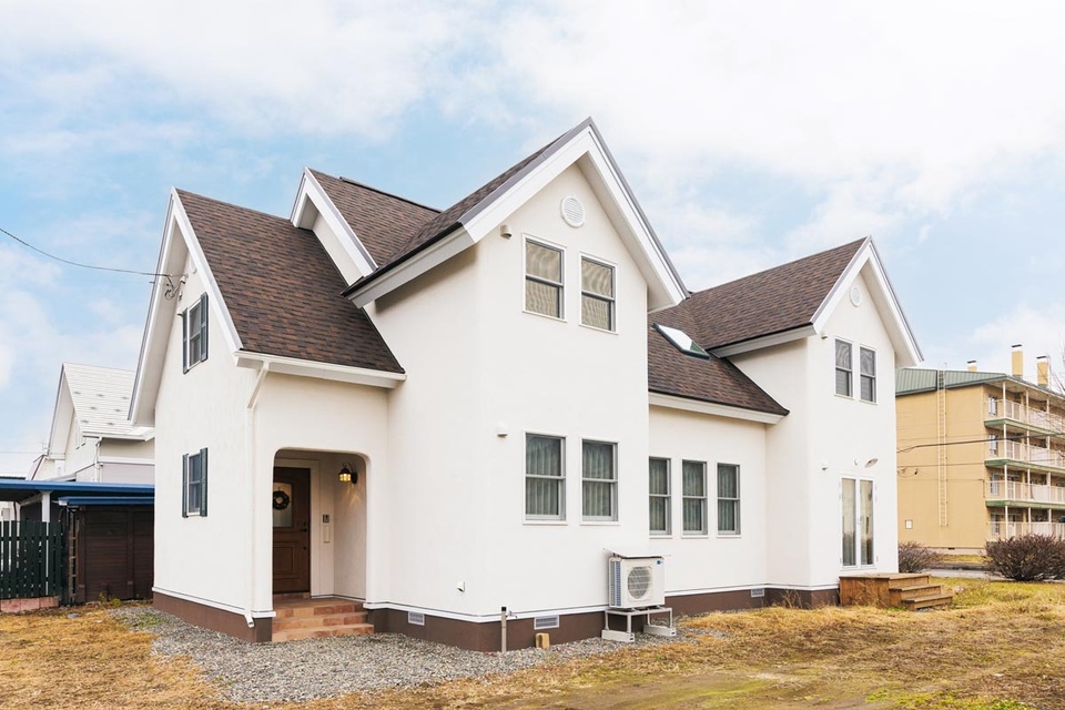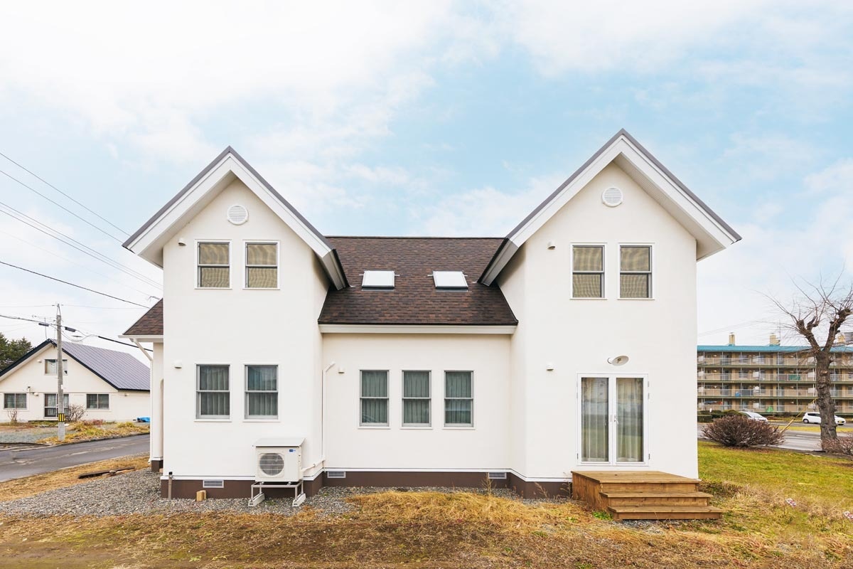 設計・施工は帯広市のcubeチセ(担当:末守恭子さん)。外観は、白い塗り壁にアスファルトシングルの三角屋根を合わせました。外壁の角の部分には丸みをもたせ、優しい印象に仕上げています。