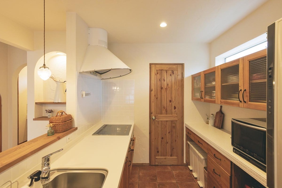 「この家で一番好きな場所です」と奥様が紹介してくれたのがこちらのキッチンです。曲線の美しい白いレンジフード(ヤマゼン)に白のタイルを合わせ、収納はオリジナルで製作しました。