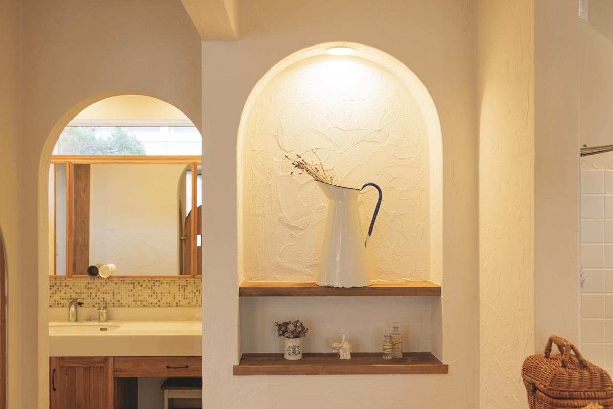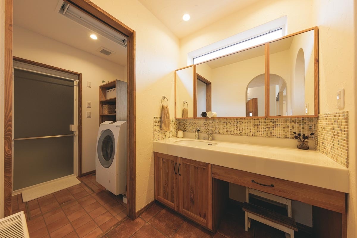 「この洗面所のタイルもそうですが、室内の照明や床材、スイッチなどはインテリアコーディネーターでもある末守さんに色々と提案してもらいながら決めていきました。どれも可愛くて、夫婦で時間をかけて悩んだのも楽しい思い出です」(奥様)