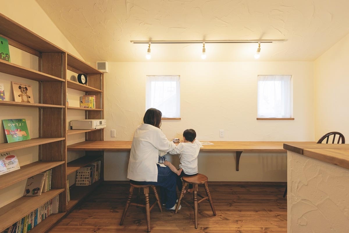 「梁が見えて、視線が吹き抜けから上に抜けて…。夜、子どもたちが眠った後にここで仕事をしながら、これが自分の家なんだなぁとしみじみ味わっています」