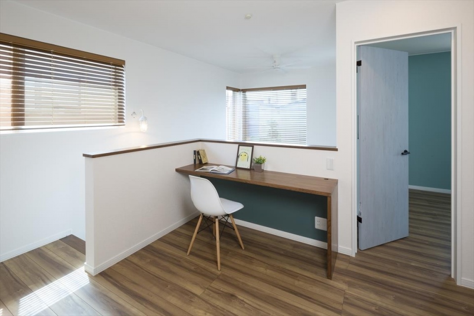 2階ホールの一角には多目的に使えるカウンターを用意。モデルハウスでは家族共有の書斎コーナーとして提案しているそう。採光とプライバシーに配慮した窓の配置にも注目です。
