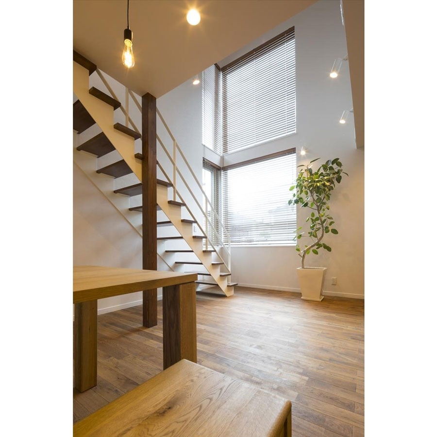 例えばリビングの吹抜。この家では、吹抜空間に加え、ホワイトに塗装したアイアン製のさらし階段もプラス。階段室を設けず吹抜部と連続させることによって、室内はより明るく、大らかな印象に仕上がっています。