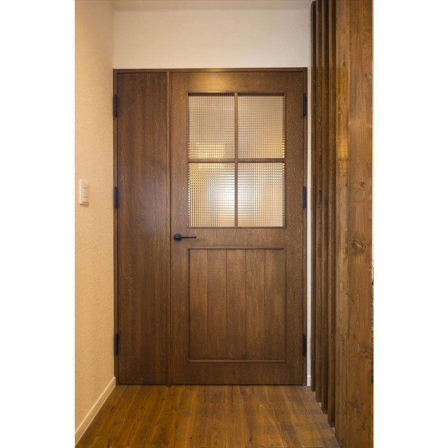 リビングドアに使われたオーダーメイドの親子ドアもその一つ。ブラウン塗装の天然木にチェッカーガラスをあしらったデザインは、重厚感に加え、どこか懐かしく温かい雰囲気。ブラックの取手や蝶番が良いアクセントになっています。