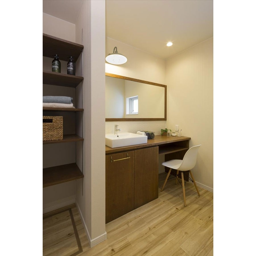 洗面・脱衣室には一間幅(約170cm)の鏡を設えた洗面台を造作。ママがドレッサーとしても使えるよう、広いカウンター下には椅子を用意。朝の身支度で混み合う時間でも、家族が並んで使うことが出来る余裕の広さです。シンク下の収納扉には把手を付けず、指をひっかけられるよう内側上部は下がり加工が施されており、デザインにもこだわりが感じられます。