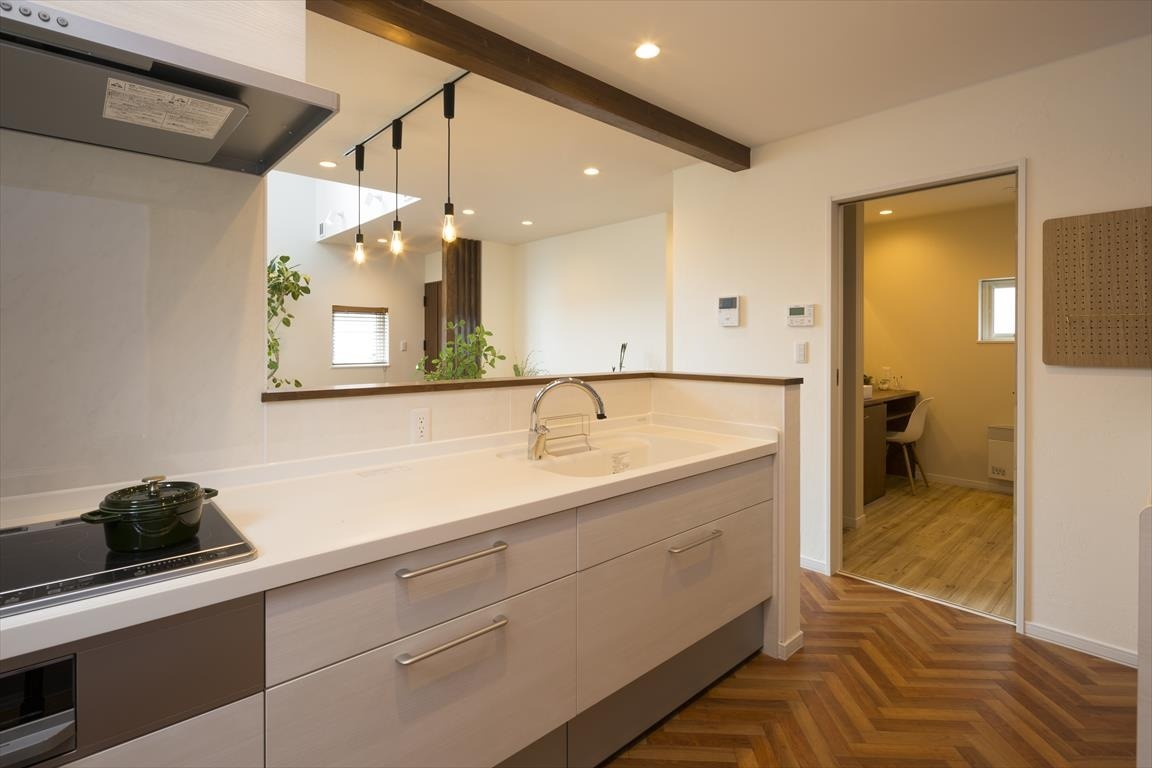 キッチンは多くの時間を過ごすスペース。台所に立っていても、家族とのコミュニケーションを図りやすいオープンな対面式で、ダイニングから家族が配膳や片付けを手伝いやすいカウンターを設けています。