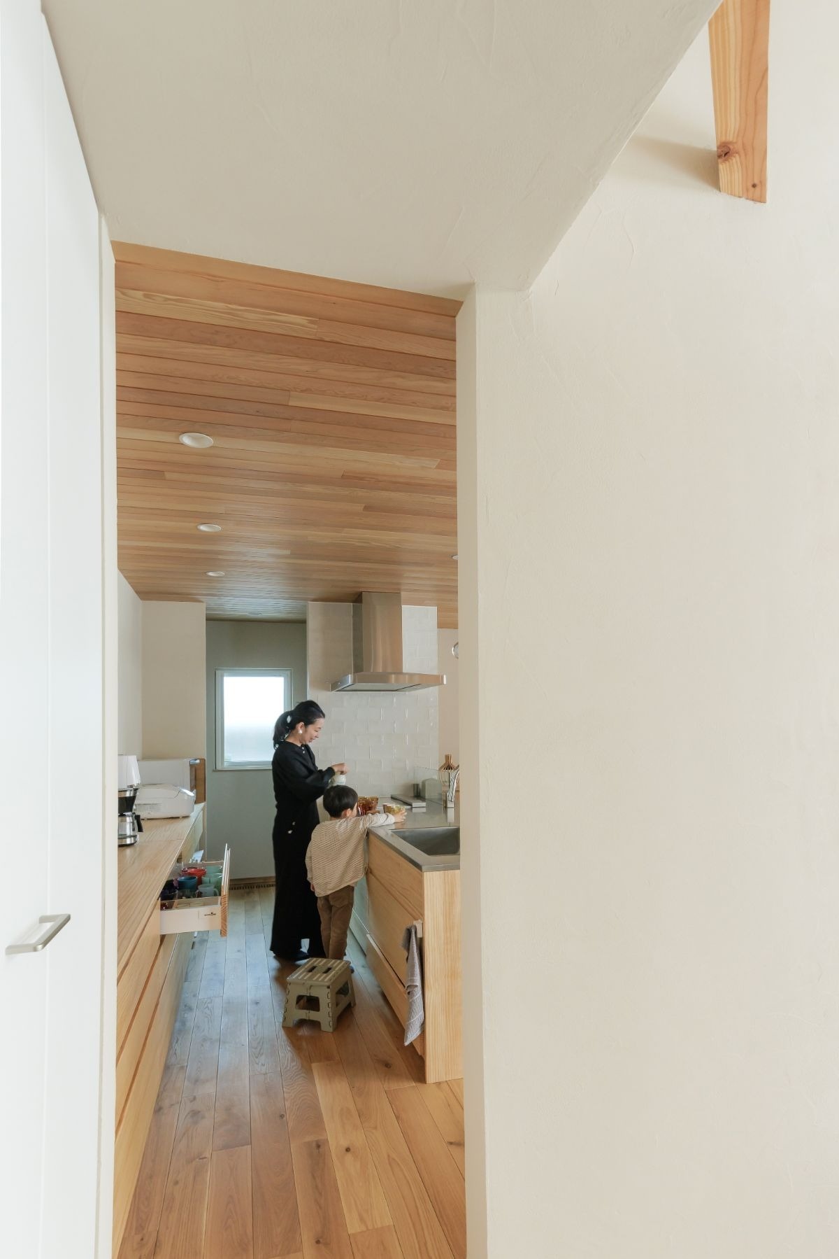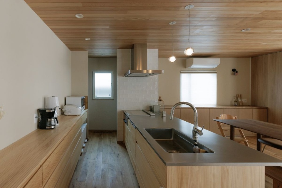 インテリアでは「本物の自然素材を使ってほしい」というご夫妻の要望を可能な限り実現しました。キッチンからダイニング、和室へと続く天井にはヘムロック(ベイツガ)の羽目板を使用しています。