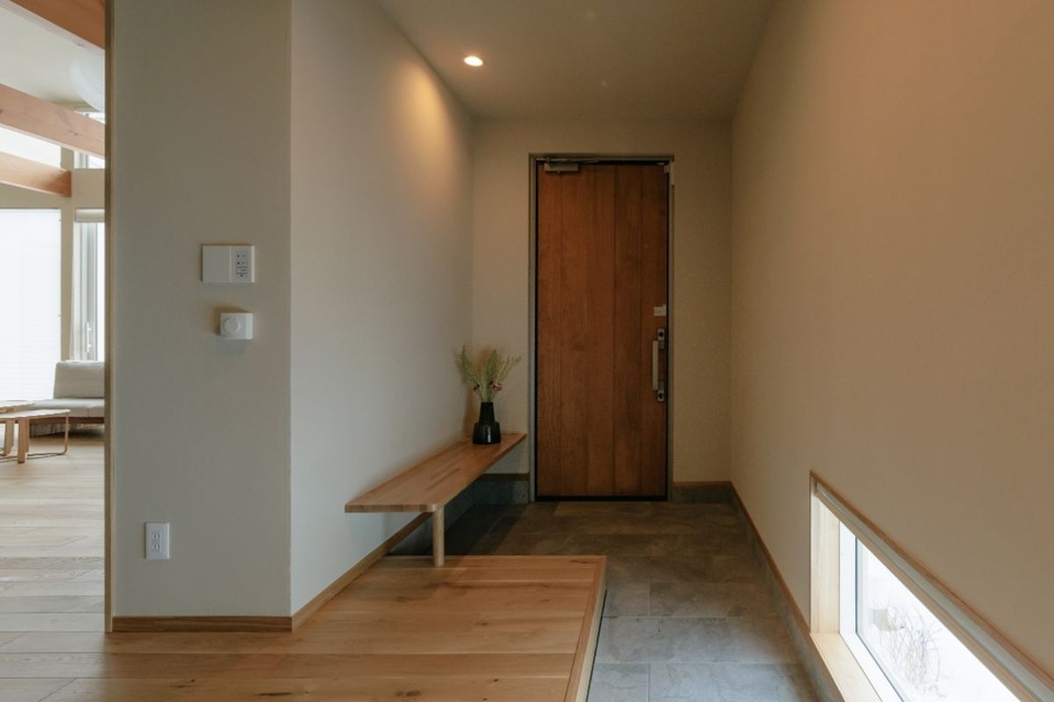 木製のドアと磁器タイル、そして地窓から漏れるやわらかな自然光の美しさを活かした玄関。床暖房付きで、寒い日も雪の日も、からりとして、靴もほんわか暖かです。
